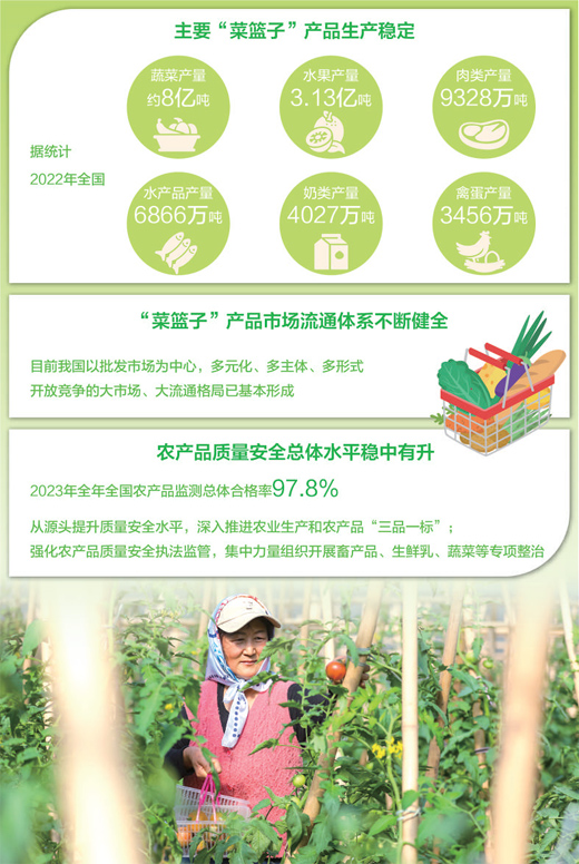 “菜篮子”连着城乡两头,关系民生。我国1988年启动“菜篮子”工程,2017年建立“菜篮子”市长负责制考核制度。总体上看,各地认真落实市长主体责任,积极推进“菜篮子”工程高质量发展,“菜篮子”产品供给充足、品种丰富、质量提高,市场体系逐步完善,较好保障了市场稳定安全供给,为满足广大人民群众日益增长的消费需求发挥了重要作用。
