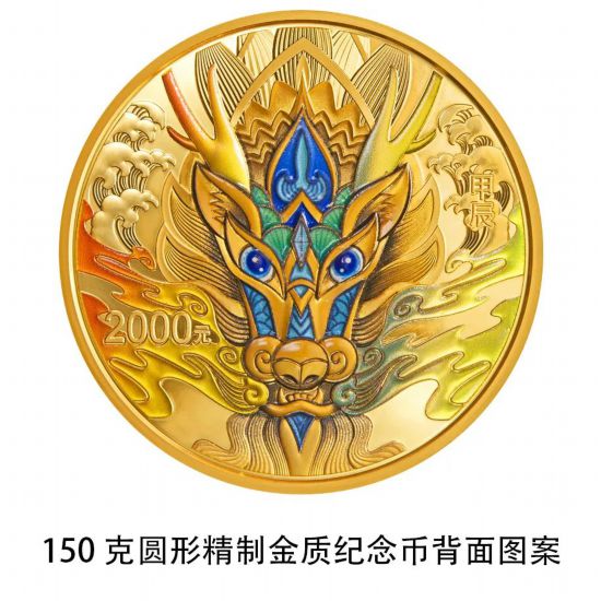 背面图案共12幅,均刊“甲辰”字样及面额。其中,10公斤圆形金质纪念币背面图案为龙造型,衬以祥云组合设计。